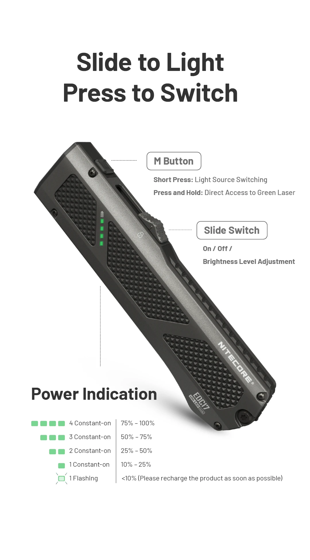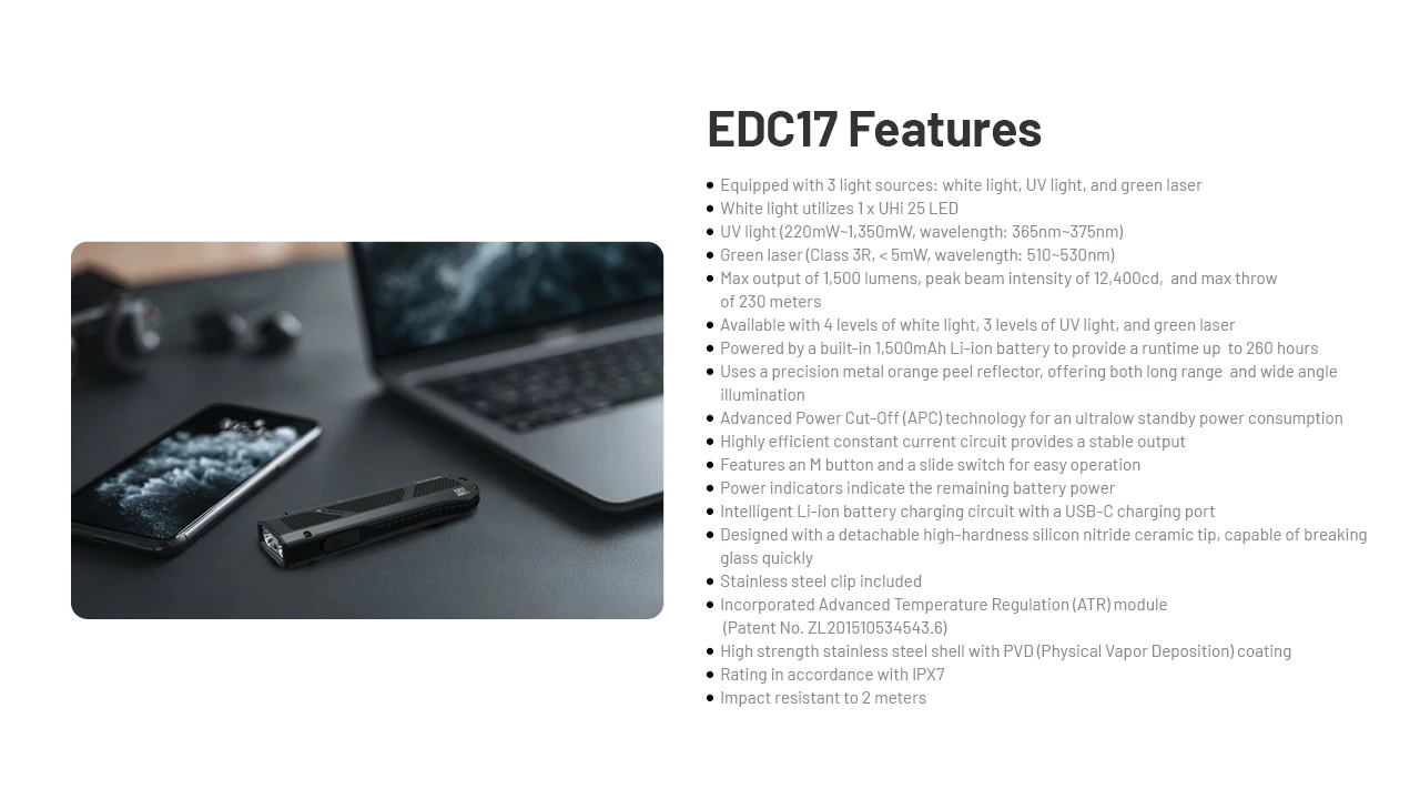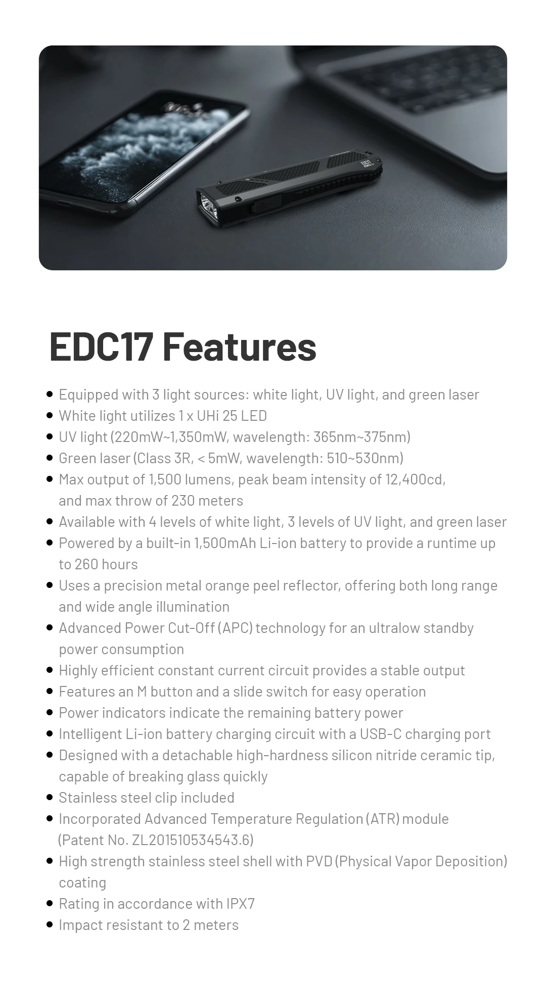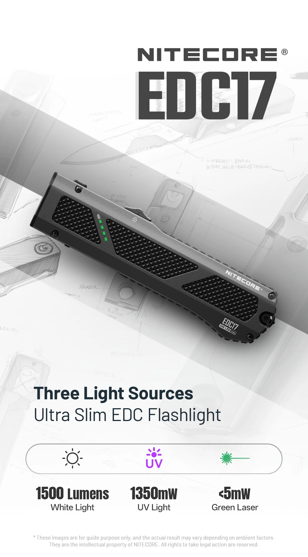 The NITECORE EDC17 Ultra Slim EDC Flashlight features three light sources: a 1,500-lumen white light, a 1,350mW UV light, and a <5mW green laser. Its simple design allows users to slide to turn it on and press to switch modes, making it a reliable everyday companion.