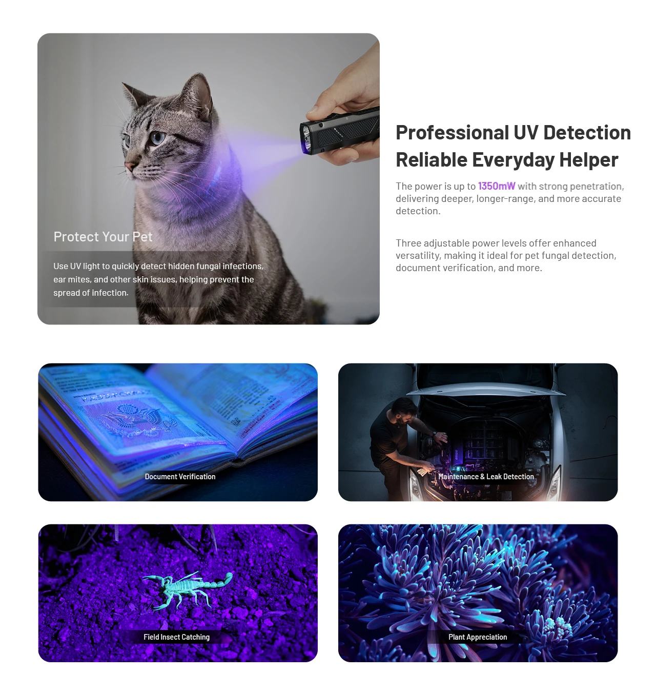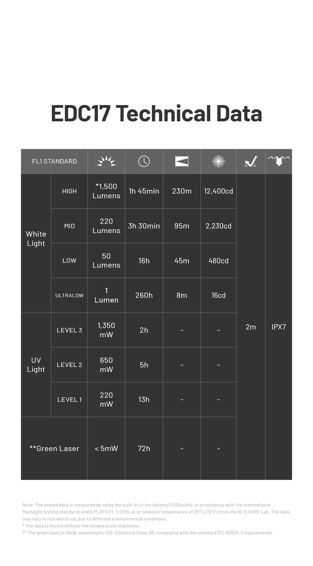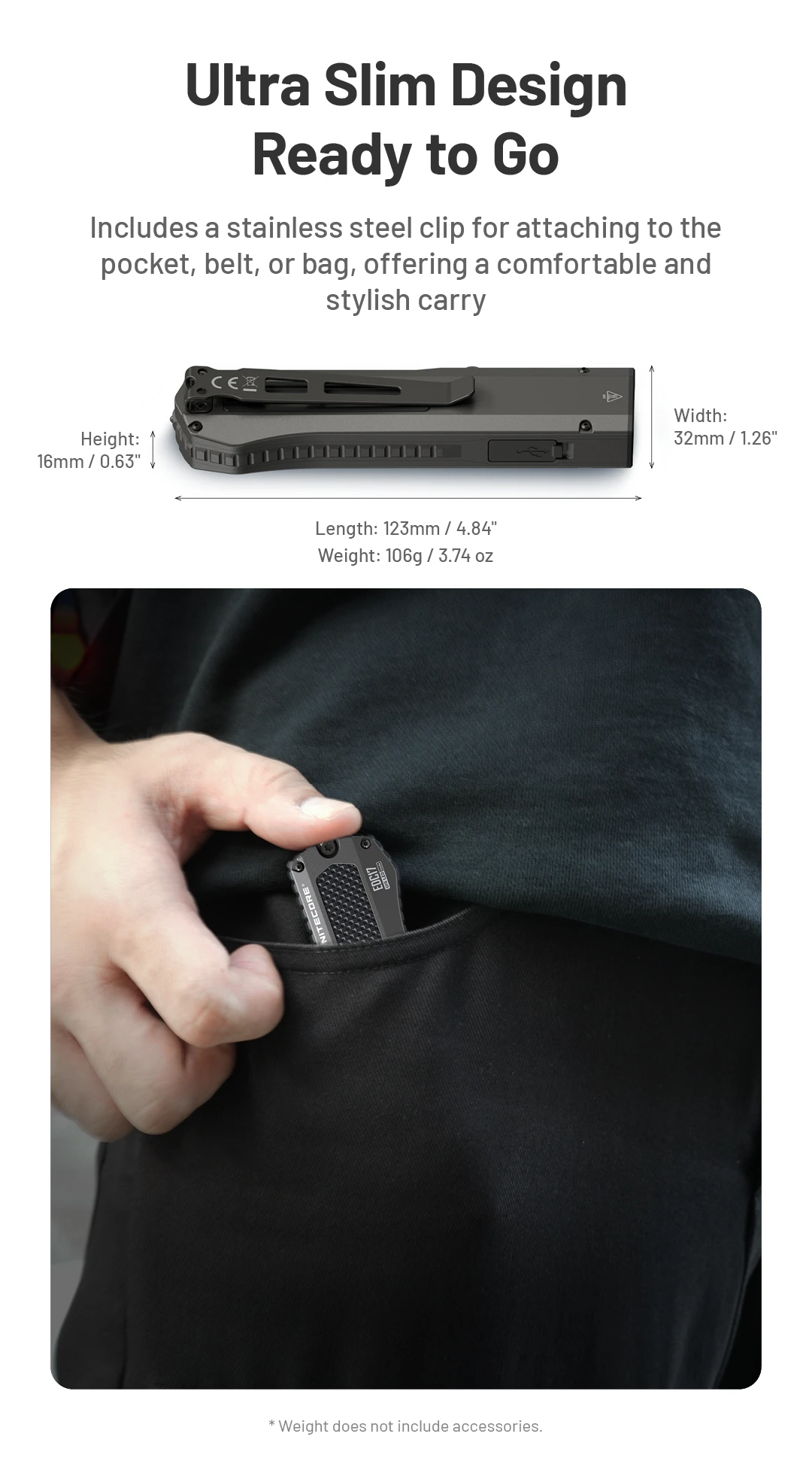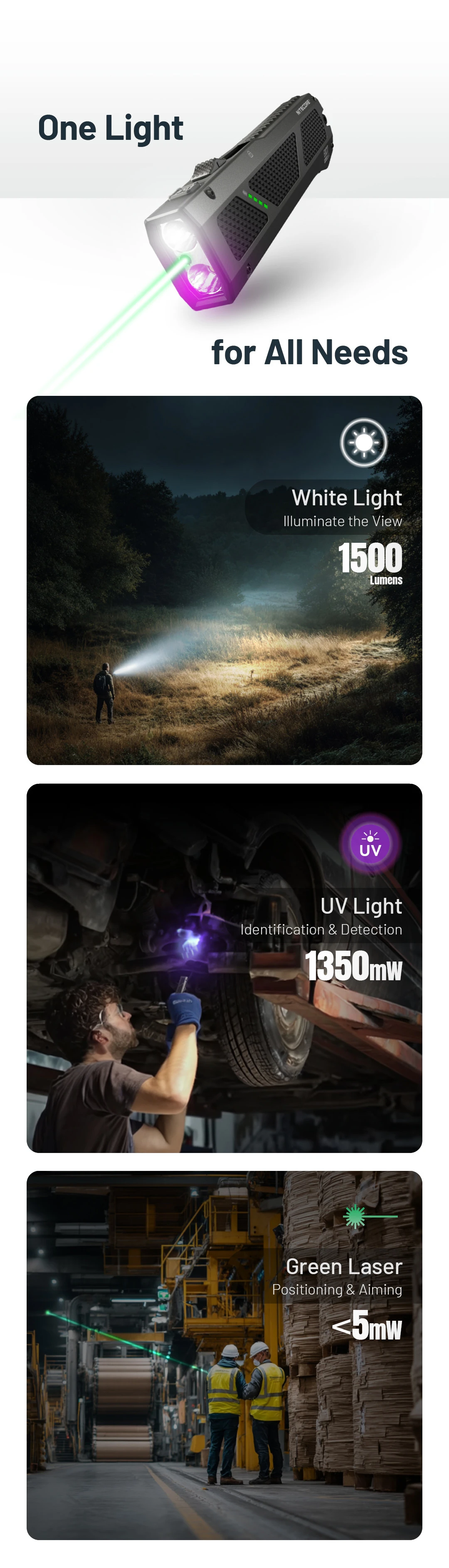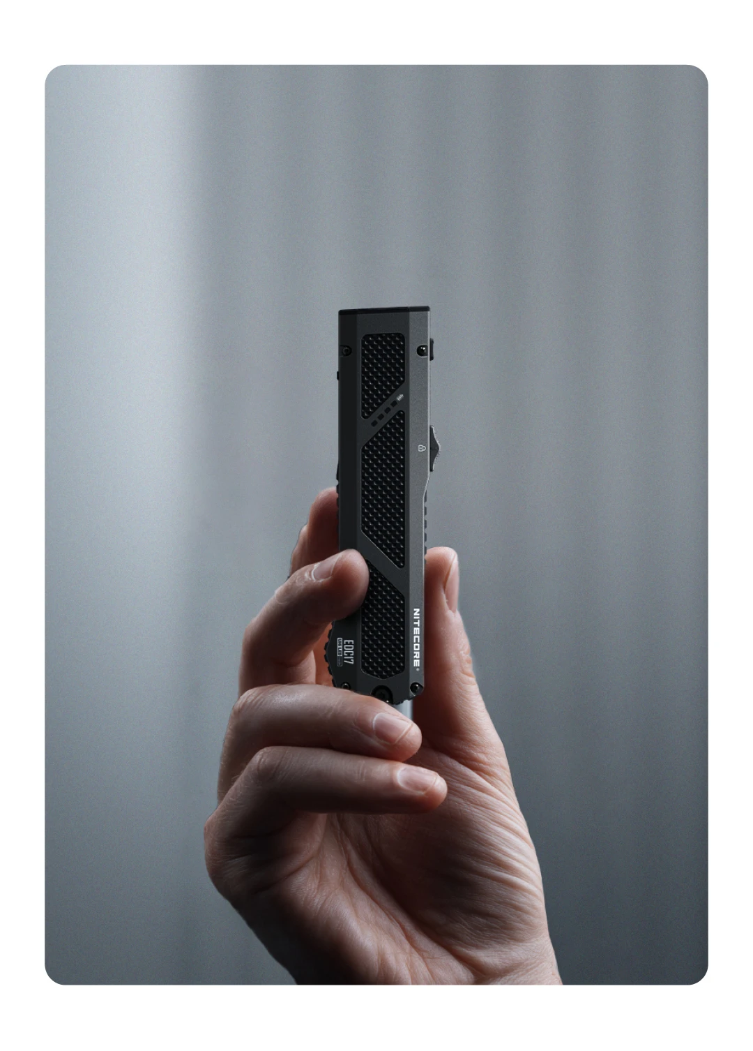 The NITECORE EDC17 Ultra Slim EDC Flashlight features three light sources: a 1,500-lumen white light, a 1,350mW UV light, and a <5mW green laser. Its simple design allows users to slide to turn it on and press to switch modes, making it a reliable everyday companion.
